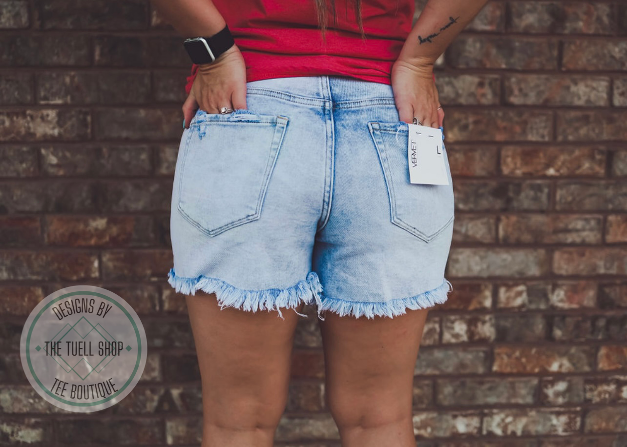 Comfort Stretch Denim | High Rise | A Line Fit | Fringe Hemline | Acid Wash.